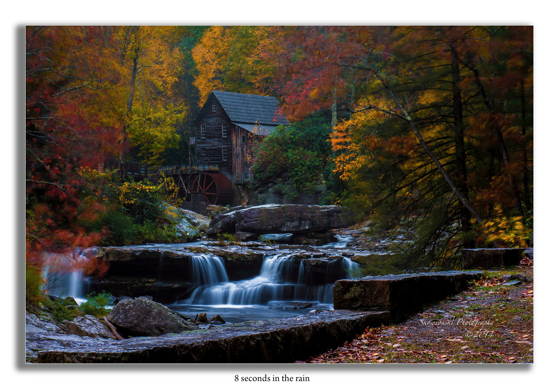This is Glade Creek Mill in Babcock State Park WVa. I got here fairly early that morning to capture this very popular mill in the classic WVa. fall colors. As I was afraid, this site was crowded with other photographers, so getting a person free shot was looking unlikely. Luck was on my side however, the weather began to turn and a good rain Storme popped over the mountain, chasing every one away to their cars. Not worried about getting wet, I draped my jacket over my camera and played with the exposure to accommodate the sudden loss of light. What I ended up with is an 8 second exposure which I hope captured the moment as I was experiencing it. I call this, appropriately I think “8 seconds in the rain”. Hope you like it.